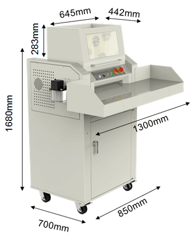 碎紙效果:5.8*50mm段狀 碎紙量:100-130張/次 功率:4KW 24h連續工作 入紙寬度:460mm 碎紙速度:9m/min 電壓:380V,50HZ 垃圾桶容積:300L 凈重:450KG 尺寸:1290mm*1300mm*1680mm | ![]() |