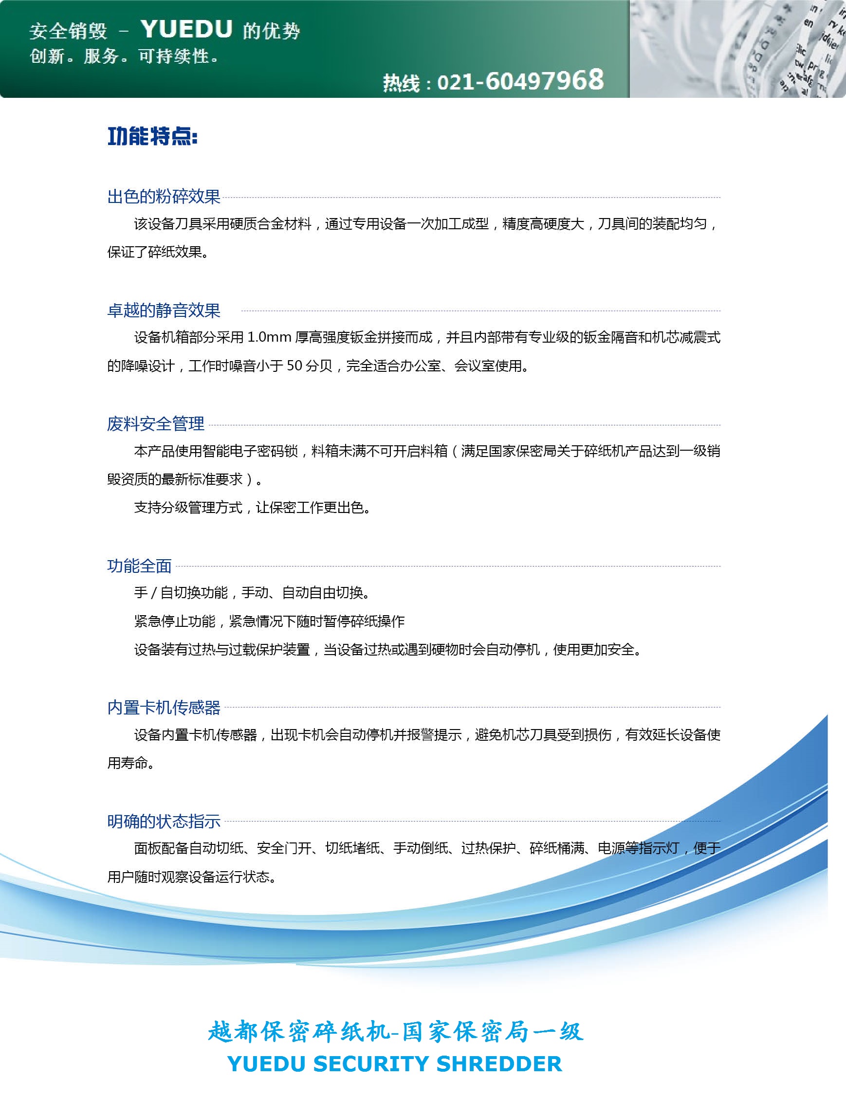 國家一級保密標準碎紙機產品宣傳資料如下: